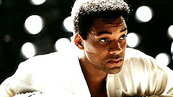 For about its first fifteen minutes, Ali is heaven. Sam Cooke (David Elliot) is on stage, wooing a crowd with a medley of his greatest hits. The tempo is slow and poignant. Overlaid upon this soundtrack is a blaze of glimpses of Muhammad Ali (Will Smith) in various postures and situations. Soon we are witnessing Ali's childhood condensed into a few, telling vignettes. In bold strokes, the racism of white America is contrasted with the soul and energy of black culture. And now the Cooke medley kicks out of slow gear and into an intense, ecstatic rhythm as the sequence builds to its height. There is only one person in contemporary cinema who could have conceived and executed this opening with such panache. Michael Mann (Heat [1995], The Insider [1999]) is a generally underrated director who deserves to be classed alongside Martin Scorsese or Brian De Palma. Few filmmakers can achieve his symphonic fusion of image, music and performance. If only the rest of Ali were as fine as that first fifteen minutes. Although there is much to admire and enjoy in the movie, it left me frustrated. In The Insider, Mann showed himself to be an artist who revels in the precise, meticulous reconstruction of documented realities. But he was able to take the real-life story of that film and bend it sufficiently to his own ends, finding a core theme that cohered all its diverse tangents and characters. The biography of Muhammad Ali proves to be more difficult, intractable material. The film covers the years 1964 to 1974 – from the Sonny Liston (Michael Bentt) fight to the "rumble in the jungle" with George Foreman (Charles Shufford) in Zaire. Mann and his three co-writers define this period, in dramatic terms, as the time in which the boxer dropped his family "slave name" of Cassius Clay and adopted the identity of Ali – beginning a journey of self-realisation that really only reaches its culmination when he melds with African culture. The broad details of Ali's life and career are, of course, widely known, even to those who are not fans of this brutal sport. Mann has to contend with our television memories of every fight, speech and interview Ali gave, not to mention Leon Gast's brilliant documentary When We Were Kings (1996). Thus, Mann is compelled to enter into a devil's pact with realistic recreation, eschewing the kinds of liberties which Scorsese liberally exploited in Raging Bull (1980). Where Scorsese rendered historic fights as fleeting, abstract, avant-garde blurs so that he could hurry back to the prolonged scenes of domestic violence, Mann is stuck with the moves that these boxers actually made in the ring. His camera has to stand back and take in the strategies, the overall choreography, and trace the narrative arc of each major fight. The possibilities for launching into the kinds of expressionist effects at which Mann excels are severely curtailed. As a realist film, it will stand or fall for viewers depending on whether Smith is accepted as a reasonable facsimile of Ali. And here one must take a leap of faith. As a performance, Smith's offering is mesmerising, delivered with maximum intensity and conviction. But he cannot match the physicality of the real Ali, and nor, to my mind, does he entirely capture the craziness, the almost "possessed" aura that Ali exuded. As biography, the film is essentially reverential, made with the full blessing and co-operation of its subject. It pretends to show Ali as a flawed human being, but goes easy on any critique of his acts and decisions. Mann's most inspired idea is to approach the multiple selves of Ali – his very different ways of behaving in and out of the public eye – primarily through the register of his voice. The Ali who whispers to his wives or confides in his family or male friends is a world away from the shouting, rapping, chanting Ali. Beyond that idea, Mann has a fairly shapeless, real-life chronicle on his hands – a collection of often strong and fascinating scenes that never coalesce into a single, solid form. One senses the director trying to forge continuities with his previous films. The role of sports broadcaster Howard Cosell (an unrecognisable Jon Voight), for instance, who enters into an unusual and touching brotherly relationship with the boxer, recalls the depiction of the media in The Insider. As in Heat, much of the action is refracted through the subjectivity of the main character, leading to a kaleidoscopic series of partial views and confused sensations. But Mann never finds a central theme that brings everything together into a satisfying whole. The closest he comes is in the story's stress on Ali's individualism. This hero is one who will always, eventually, choose his own, intransigent path over that dictated by the government or even his religion. But this emphasis, in turn, chafes against the film's close attention to the social make-up of Ali's environment. When it comes to a figure such as Don King (Mykelti Williamson) – of whom Ali's wife Belinda (Nona Gaye) dryly comments that he "talks black, acts white and thinks green" – this is a surprisingly forthright and politicised Hollywood blockbuster. I have learnt never to entirely trust my first impressions of Mann's films. They almost always improve with repeat viewings, often revealing secret themes and structures. But I seriously doubt whether Ali, for all its fine moments and aspects, will take a place alongside the director's masterworks. MORE Mann: Collateral, The Last of the Mohicans, Ferrari MORE biopics: Auto Focus, The Aviator, Basquiat, De-Lovely, Heart Like a Wheel, I Shot Andy Warhol, Kundun, The Life and Death of Peter Sellers, Man on the Moon, Malcolm X, Nixon, The People vs. Larry Flynt, Pollock, What's Love Got to Do With It? © Adrian Martin February 2002 |
