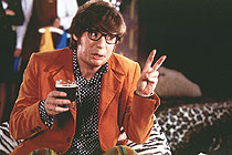 For about its first twenty minutes, this debut film in the Austin Powers series raises one's spirits and expectations very high. Austin (Mike Myers) choreographs a swinging, sexy fashion shoot on the streets of London, runs from his screaming girlie fans ... and suddenly bursts into a groovy dance, along with every limber passer-by and bobby. Having splashed this '60s pop culture nightmare all over the screen, the film gets down to its particular parodic task: a melange of elements from the James Bond 'international espionage' genre, including a host of crazy futuristic gadgets, a svelte sidekick who's good with her fists (Mimi Rogers) and a mean villain named Dr. Evil (also played by Myers) who has a Dr. Strangelove air. When Evil shoots himself into space, cryogenically frozen, the government decides that Austin must be frozen too. Thawed out in today's world for a re-match with his old foe, Austin of course behaves in the only manner he knows – such as instantly wanting to 'shag' Vanessa (Elizabeth Hurley), who happens to be the daughter of his former partner. I kept hoping the plot would reveal Austin to in fact be Vanessa's father – but that would perhaps be a weighty complication for such a breezy divertissement. Myers serves as writer and co-producer as well as star, and that probably makes him the 'auteur' of the piece over debuting director Jay Roach. The film continues in many ways the comic sensibility we recognise from Myers' fabulous Wayne's World movies: a taste for intricate pastiche; a delight in gags that trade on the corny and obvious; and a vulgarity centred on the usual bodily functions and embarrassments. In other words, Myers walks a curious, precarious highwire stretched between 'postmodern' knowingness and 'dumb and dumber' burlesque. Someone should have told him, this time around, that his audience is not so dumb as to need almost every idea for a funny scene laboriously played out twice across the course of the movie. We have yet to see the ultimate 'time warp' movie about a character experiencing severe culture shock in a future era. Austin Powers is even less inventive in this regard than the Back to the Future movies. Apart from a predictable string of jokes comparing '60s free love to '90s safe sex, and a wasted scene where Austin watches a newsreel compilation of momentous world events, the film makes almost nothing of the changes in politics, culture and social mores. One of the biggest problems with Austin Powers is the rather tired sense of déjà vu it induces. The Bond craze had already spawned numerous parodies by the end of the '60s, and they are in most respects more excessive and outrageous than this take-off. A mini-festival of Modesty Blaise (1966), Casino Royale (1967), What's New, Pussycat? (1965) and The Tenth Victim (1965) would be a more eye-popping visual experience – and also a lot more fun. Nonetheless, there is a fair amount of wicked pleasure to be had from Austin Powers, especially for those who may be just now discovering such pop-camp delights of the '60s as The Avengers or Get Smart. And there are some truly wonderful set-pieces, such as the scene (worthy of Barbarella, 1968) in which Austin does a rude dance in order to short-circuit a small army of seductive killer 'fembots'; and the ultimate face-off between Austin and his nemesis Dr. Evil, which manages to subvert that classic melodramatic line spoken by villains to heroes in hundreds of action movies: "You and I, we are not so different ... " MORE Austin: Austin Powers: The Spy Who Shagged Me, Austin Powers in Goldmember MORE Roach: Meet the Fockers, Mystery, Alaska © Adrian Martin August 1997 |