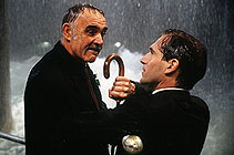 This big screen version of The Avengers starts surprisingly – with dark, turbulent music and a credit sequence with tremendous design sense. But, come the first shot of the dapper Steed (Ralph Fiennes) strolling down a pleasant-looking street that hides life-threatening dangers of many sorts, the old, musical theme from the television series strikes up – and we are on familiar ground. Actually, that design sense never leaves the movie. The Avengers is a visual and architectural feast, but its more mundane thriller content is going to disappoint many people. There's not much to the plot – the extravagant villain of the piece is Sir August De Winter (Sean Connery), a power-mad, Evil Genius who holds the world to ransom by controlling its weather. To spice things up a little, he clones himself an evil, leather-clad twin of Emma Peel (Uma Thurman). Weather and tea are the two obsessions of this film. The often witty humour in Don Macpherson's script comes from the way it juxtaposes lethal and melodramatic events with the British penchant for the routine and the banal. No situation is so dire that it cannot provide a pause for refreshment and small talk. Since The Avengers has arrived with an awful critical rap from overseas, many of its virtues are likely to be overlooked. Director Jeremiah Chechik (Diabolique [1996]) struggles with the monotony of the situations and jokes, but he gives a lot of energy and style to this project. His grasp of a certain pop surrealism – as in a wonderful scene showing Steed in a red telephone booth in the middle of nowhere, almost blown away by a growing monsoon – is refreshing. The wacky, ultra-camp humour – all the bad guys are dressed in brightly coloured, oversized bear costumes – is occasionally overplayed. But, for the most part, The Avengers resembles a lively mix of Modesty Blaise (1966) with Dark City (1998). As in those movies, the look registers more powerfully than either the story or characters. But what a look: London is rendered as a place of fantastic, pristine aristocracy, completely depopulated except for a dozen or so scuttling secret agents. The central actors are very enjoyable to watch. The script tries hard for a frisson between Steed and Emma and some vague drama involving trust and suspicion, Hitchcock-style, but all it really allows the actors are opportunities for action, poise and fun. That is almost enough: a splendid moment in which Steed helps Emma put on her magnificent boots after yet another scrape ("it's too tight" – "so push") is alone worth the price of admission. Rabid fans of the television show will probably have too many impossible-to-satisfy expectations of this film. The problems of blowing a TV-style narrative up to cinema proportions have still only been solved by De Palma's Mission: Impossible (1996). But don't be completely discouraged by the adverse reactions: it is still a terrific spectacle, best caught in theatres rather than on a small screen. The Avengers' charms may be slight and fleeting, but they are charms nonetheless. MORE Chechik: Benny & Joon © Adrian Martin November 1998 |