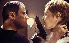 John Travolta has an evident liking for military subjects. Apart from the Scientological, intergalactic war of Battlefield Earth (2000), he has donned military outfits for The Thin Red Line (1998) and The General's Daughter (1999). And corruption in the military institution seems especially appealing to him as an actor, coming up once again as a principal subject in Basic. Here, Travolta plays Tom, an ex-army man pulled in to help with an especially mysterious case of field action. A Special Forces mission has gone horribly wrong, and the tyrannical Sgt. West (Samuel L. Jackson), along with most his team, are dead. Only two survive: hard-as nails Dunbar (Brian Van Holt) and flamboyantly gay Kendall (Giovanni Ribisi). Their accounts of the disaster do not match. For at least half of its running time, Basic comes across as a taut, spiky story of military procedures gone awry. Director John McTiernan, working more economically than he did in his Die Hard era, is adept at sketching out the interpersonal diagrams of loyalty, lust and hatred. Even the rather predictable sexual tension between Tom and Julia (Connie Nielsen), his partner in interrogations, is fun to watch. Travolta is better in this film than he has been in years. But, at a certain point, the tension snaps and we enter a whirlpool of reversals and revelations. As in The Life of David Gale (2003), the seriousness of the subject is frittered away as the viewer struggles to retroactively re-establish the logic of the plot. MORE McTiernan: Last Action Hero, Predator © Adrian Martin May 2003 |