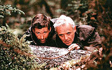 It is not easy accounting for the strong appeal of The Edge. Its subject – two men in conflict with each other and a harsh, natural wilderness – is old-hat. As a contemporary action movie, it does not even begin to pass muster. The key personnel are no more inspiring: director Lee Tamahori, whose previous project Mulholland Falls (1996) lost the verve displayed in his debut Once Were Warriors (1994); and America's Great Overrated, David Mamet – a dramatist much given to bombast and bluster. The film's simplicity, however, works in its favour. Mamet loves the spectacle of men slugging it out – and here, for a change, he lets their gestures speak louder than a torrent of archly stylised words. Charles (Anthony Hopkins) and Robert (Alec Baldwin) form a familiarly odd and volatile couple – the former a cold intellectual whose only knowledge of life comes from books, the latter a fast-talking, smooth-walking operator. The story starts at a cosy resort in Alaska. Charles's wife Mickey (Elle Macpherson), a model, sets her husband's nerves on edge as she subtly flirts with Robert, a fashion photographer. During a helicopter ride, Charles pops the million dollar question to his possible rival – "when do you plan to kill me?" – and then, in a ripe melodramatic touch, the plane crashes before Robert can formulate an answer. This tale of outback survival deftly tempers classic testosterone-soaked issues – jealousy, virility, revenge – with an unlikely dose of New Age journeying and bonding. The film recalls that underrated psychological thriller Zero Kelvin (1995) in its mixture of angst, aggro and unexpected tenderness. Tamahori coaxes commendably restrained, natural performances from stars who are often overwrought elsewhere. The spectacular element of the material is downplayed. There are a few falls, blows and cuts, a big bear and a very scared companion (Harold Perrineau) along for part of trek – but, for the most part, The Edge generates its considerable frisson from small details: a makeshift compass, a fire that won't ignite, threatening sounds in the distance, hastily prepared traps and weapons. It may be Deliverance (1972) in a minor key, but it is none the less finely crafted and immensely satisfying. MORE Tamahori: Along Came a Spider, Die Another Day © Adrian Martin February 1998 |