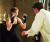 Here is a film worth defending. Judging from the uneasy response of the crowd at the session I attended, pitched somewhere between titillation, derision and amazement, it clearly hits a raw nerve. Its strange mixture of glossy Hollywood unreality and social provocation marks it is a pop culture event of significance. Enough takes us back about a decade to the tropes and trials of the intimacy thriller, action-based films in which the most sinister menace is not external but found far too close too home. The family doctor, cop, lawyer or psychoanalyst; the babysitter, secretary or best friend; and ultimately the main character's parents, children or spouse take the evil roles in these movies. Slim (Jennifer Lopez) falls for a charming guy, Mitch (Billy Campbell), and builds the perfect home and family. Of course, it is all an illusion. Mitch turns out to be a philanderer and an abuser. Worse still, he is psychotically possessive of his wife and small daughter, Grace (Tessa Allen), and vows to track them down wherever they flee. Gifted writer Nicholas Kazan is well suited to this terrain, having scripted Reversal of Fortune (1990) and directed his own marriage-gone-wrong thriller, Dream Lover (1994). He uses chapter titles in early scenes to distance us from the seeming trashiness of this material, all the while bringing out its greater resonances. Slim is caught in a symbolic bind worthy of the Gothic heroines of old. As her friend Ginny (Juliette Lewis) tells her, the modern girl wants a "real man" full of testosterone, but baulks when this man shows his true, patriarchal colours. What's the alternative? Slim's ex-beau (Dan Futterman) is cute, helpful and sensitive. But does he turn her on? This is only the first of many intriguing and often wildly politically incorrect questions that the film raises. The core of the story is Slim's transformation from a passive weakling into a sleek, trained fighter. By the time we reach the key line of dialogue, "You have a divine, animal right to protect your own life and the life of your offspring", the film is ready to plunge headlong into that disquietingly lawless realm beloved of the best intimacy thrillers. Enough marks the finest hour of director Michael Apted, who has dabbled in virtually every fictional genre as well as documentary. Abandoning his trademark realism, he embraces the zany leaps and excesses of this project with a real élan. The tense scenes of hiding and pursuit across several states of America are executed with enormous flair, and the finale is riveting. Lopez, despite the standard Hollywood silliness of having everyone on screen call her "plain looking", exudes divine, animal righteousness. Kazan and Apted give her many wonderful moments, from a discussion of Finnegan's Wake in a diner to mystical sessions with an imposing martial arts trainer. But none of these details are as great as the tiny, throwaway moment in the coda when a word from a stranger suddenly makes Slim believe that her life could amount to more than life-long imprisonment in a man-made hell. MORE Apted: Coal Miner's Daughter, Continental Divide, Critical Condition, Extreme Measures, Incident at Oglala, Nell, 35 Up, The Up Series © Adrian Martin October 2002 |