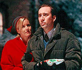 In an odd way, the premise of the saccharine romantic drama The Family Man exactly inverts that of the Bedazzled remake (2000). In the Faustian comedy of Bedazzled, an ordinary guy, downtrodden in his banal existence, is offered a fabulous, alternative life by the Devil. At the start of The Family Man, Jack (Nicolas Cage) is already enjoying the high life about which the hero of Bedazzled can only dream. He is a wildly successful, workaholic, corporate type, with a swish apartment and beautiful women at his beck and call. However, a chance meeting with a gun-toting bum, Cash (Don Cheadle), shifts Jack into the past he once refused – a lower middle-class home in the suburbs with Kate (Téa Leoni). This film is so dreary that one can only alleviate the boredom by enumerating such comparisons with other movies. Like Rachel Griffiths in Me Myself I (1999), Jack gets to confront for the first time such daily, mundane horrors as nappy changing, predatory neighbours and extended family barbecues. Like Harrison Ford in Regarding Henry (1991), he discovers a new, better self far from the cold corridors of capitalist power. Like Gwyneth Paltrow in Sliding Doors (1998), he gets to experience the romance-that-could-have-been. Of course, The Family Man strives above all to be a modern version of Frank Capra's classic It's a Wonderful Life (1946) – with Cash functioning as the guardian angel who can be summoned by the tinkling of a bell. However supernatural this set-up, the film is utterly devoid of spiritual or religious themes. Nor does it really face up to the central challenge laid down by Capra: if you are going to make a film extolling the joys of an average life, you had better make it seem like an extremely attractive option. There are at least three problems facing The Family Man on this score. The first is the casting of Cage – a sombre, intensely histrionic performer who is right for Bringing Out the Dead (1999) but almost always wrong as the lead in comedies and romances, except when he can be suitably grotesque (as in Moonstruck, 1987). The second problem is that the filmmakers have so little time for what constitutes everyday family life – especially kids. Jack's "I have seen the light" speeches late in the film about the wonders of raising children come virtually out of nowhere. The same unbelievability hangs over the depiction of his boorish, supposedly salt-of-the-earth bowling buddies. The third and most glaring problem is the decor. Production designer Kristi Zea, who had such fun with the gangster homes in Goodfellas (1990), again has a ball recreating these garish eyesores of suburban interiors. But the superior laughter, shared by director Brett Ratner, completely betrays what the film is meant to be saying. While it huffs and puffs about love, sacrifice, struggle and choices, The Family Man is truly interested in only one thing: that great contemporary cultural obsession known as lifestyle. By the time Jack has started fondly stroking bricks the way that James Stewart kissed his stairway in It's a Wonderful Life, we are far from being convinced by his idiotic gesture. No matter what the film asserts, its own cold heart is still back in those gleaming boardrooms, limousines and luxury apartments. MORE Ratner: Red Dragon, Rush Hour © Adrian Martin January 2001 |