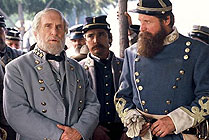 As American Civil War films go, any ten minutes of Sergio Leone's masterpiece The Good, the Bad and the Ugly (1966) is worth more than the entire three and a half hours of the epic Gods and Generals, a leaden, interminable piece of patriotic chest-beating. Based on Jeff Shaara's bestseller, this film rolls out history with a capital H. Key figures, including "Stonewall" Jackson (Stephen Lang) and Robert E. Lee (Robert Duvall), appear as if posing for statues, in full military garb and uttering the lines for which they are best known. The film is picturesque and static. A scene of Colonel Chamberlain (an uneasy Jeff Daniels) earnestly reciting the "Hail, Caesar" speech before battle is its nadir. Not even a blast of Bob Dylan in his Americana mode over the closing credits can save proceedings. Although it contains much disturbing and largely unironic invocation of righteous, religious belief in the name of war – offering an uncomfortable parallel with the American present – Gods and Generals tries to be politically correct to a fault. Women and African-Americans become saintly, wise figures on the periphery of the action, the true heart and soul of the nation. And of course, whenever the mournful pipes start wailing on the soundtrack, we are reminded for a split second or two that war is, after all, hell. In a gruesome way, a special Bob Dylan song at the end stands for this pile-up of progressive intentions and conservative capitulations. Director Ronald F. Maxwell has come a long way down since the salad days of Tatum O'Neal and Kristy McNichol in Little Darlings (1980). Of course, he would not see it this way. In Gods and Generals he has huge resources and an enormous canvas at his disposal. With Gettysburg (1993) and this under his belt, Maxwell is now aiming for a trilogy. The eventual ten-hour DVD compilation is sure to be a slog. © Adrian Martin October 2003 |