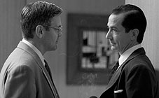 George Clooney's second directorial effort, Good Night, and Good Luck, goes down so quickly and painlessly that it is easy to forget it five minutes after leaving the cinema. Abandoning the postmodern pyrotechnics that filled his debut, the curious Confessions of a Dangerous Mind (2002), Clooney here adopts a quiet, measured style. The hush that falls over the film is presumably meant to signal the moral seriousness of the occasion. In the earnest tradition of Robert Redford's Quiz Show (1994) and Michael Mann's The Insider (1999), Good Night, and Good Luck addresses an intriguing, historic case of ethical struggle within the American media industry. During the 1950s, Edward R. Murrow (David Strathairn) and his television current affairs team took on the powerful figure of Senator Joseph McCarthy. They did so not because of political ideology but because of a belief in reporting the truth, especially in a climate where hysteria ruled. Using very generous dollops of newsreel footage (fans of Otto Preminger's classic 1959 courtroom drama Anatomy of a Murder will recognise Joseph Welch, who in real life fearlessly interrogated McCarthy), Clooney spins a cautionary tale about the fate of television journalism in an entertainment age. It's hard to disagree with this lesson, but equally hard to get terribly excited by it. The claustrophobic world of the television studio is well conveyed (Clooney's father was a newscaster), and the banter between journalists is pleasingly captured – although the script (co-written by Clooney and Grant Heslov) has trouble bringing a subplot concerning "secret lovers" Joe (Robert Downey Jr) and Shirley (Patricia Clarkson) to life. The widespread claim that Good Night, and Good Luck is a bold, progressive film is laughable. It is the type of movie that aims for its target audience and then flatters it relentlessly. No one drawn into this movie can ever feel confused or uncertain; the virtuous heroes and venal villains are earmarked from the first scene, and the values for which each stand remain rock solid to the end. It is a "thesis film" designed to make us feel we are on the right side of the moral and political fence – and then we are able to simply return to our daily lives, unmoved and unchanged. Everything else in the film – the cool jazz music, the elegant black and white cinematography (by Robert Elswit) and the understated performances – merely serves to grease the wheel of this inoffensive but facile seduction of the viewer. © Adrian Martin December 2005 |