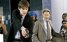How's this for a high concept? Two cops, one old, the other young. The irascible, seasoned guy, Joe (Harrison Ford), moonlights as a real estate agent, so he's always taking urgent calls and making deals while inspecting murder sites. The new recruit, K.C. (Josh Hartnett), is a gentle, New Age soul who runs a yoga class when he's not involved in car chases or shoot-outs. Hollywood Homicide is the kind of desperate entertainment package that keeps leaping between lifestyle comedy and an action-thriller plot – the latter providing the film's third novelty ingredient, a glimpse into the cutthroat world of the hip hop industry. But the police thread is purely perfunctory, and laughs are thin on the ground for the rest of the time. Director and co-writer Ron Shelton (White Men Can't Jump, 1992) tends to lose grip on his material when the subject is not sport. There is only one trademark he vainly tries to smuggle into Hollywood Homicide: a supposedly adult view of sex between people of a mature age. But he has fallen a long way from the glory of Susan Sarandon in Bull Durham (1988). Here the repartee between Joe and his sophisticated lover, Ruby (Lena Olin), never gets above Viagra jokes and silly sex poses tastefully linked by fades. MORE Shelton: Play It to the Bone © Adrian Martin September 2003 |