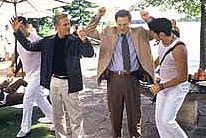 Increasingly, I believe that many people go to movies to hear a bunch of songs pumped through a good sound system in a vast, dark room. With the added ingredients of bright colours, good-looking actors, and something vaguely resembling a plot, listening to music in this way is much more enjoyable than shelling out for the soundtrack CD and hearing it back home. For much of its running time, The In-Laws intrigued me mainly on the level of its song selections – just as the dud Darkness Falls (2003) will be remembered only for its surreal pastiche of Johnny Cash's "Ring of Fire". It sounds like a radio tuned to a nostalgia station: Paul McCartney, The Bee Gees, Electric Light Orchestra – culminating in a rousing, live appearance by KC and the Sunshine Band. The character of these songs has nothing to do with the story or its setting – except for the fact that this is a remake of Arthur Hiller's 1979 movie of the same name. The basic plot is retained – mild-mannered Jerry (Albert Brooks) finds himself reluctantly swept up in the deep covert CIA operations of Steve (Michael Douglas) on the eve of the marriage of their respective children – and a few minor twists added. As Steve's throwaway chant of "Judy, Judy, Judy" to his seething ex-wife, Judy (Candice Bergen), indicates, this remake tips its hat to Cary Grant, and especially Hitchcock's North by Northwest (1959). Director Andrew Fleming (Threesome, 1994) tries for a similar mixture of suave sophistication, burlesque pratfalls, verbal humour and mild action-adventure thrills – adding just a little trash comedy homophobia to suit contemporary, multiplex taste.In a low level way, it's sort of enjoyable. Brooks is always a joy to watch, even when he is merely doing his worried-guy shtick (also exploited, to better effect, in Finding Nemo [2003]). And Douglas is well cast as a smiling, gregarious glad-hander with a hidden agenda always up his sleeve. © Adrian Martin August 2003 |