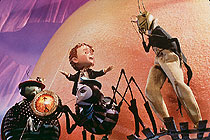 As a child, I somehow managed to miss an encounter with the stories of Roald Dahl. Thanks to the movies, I began catching up with their special, hard-edged charm. After Danny DeVito's vigorous and moving rendition of Matilda (1996) came a mostly animated version of James and the Giant Peach by Henry Selick (The Nightmare Before Christmas, 1993). It is a stirring and magical tale. Like Matilda, James (Paul Terry) is an existential child-hero, alone in the world after being deprived of his parents. James finds a way to escape from his grotesque aunts Spiker (Joanna Lumley) and Sponge (Miriam Margolyes) when magical green worms offer him a giant peach. Selick's artistry really kicks in once the film switches over to animation. Through a clever procession of plot events, gags and sheer visual poetry, everything – including James and his merry gang of bug companions – lives in a state of constant transformation. The giant peach itself becomes variously a home, a vehicle, a meal and a sun in the sky. Dahl's story is something of a dark fairy tale, with some marvellous moments of gruesome action realised superbly by Selick and his team. It is also, in its quiet and lyrical way, a subversive ode to the autonomy of children, their identities and desires. One of Randy Newman's sub-Gershwin songs has this little hero simply state: "My name is James, James, James!" – and it is a very moving declaration. MORE Dahl: Charlie and the Chocolate Factory live-action Selick: Monkeybone © Adrian Martin April 1997 |