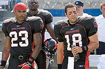 Robert Aldrich's The Longest Yard (1974) has been remade both under its British title (Mean Machine, 2001) and now under its original title. But star and co-producer Adam Sandler may not have been entirely joking on the Australian television show Rove Live when he claimed to have never seen his source. This is because, for many viewers today, The Longest Yard, like many classic films, mainly only exists as a high concept or a tag line: a bunch of hardened prisoners fight their brutal wardens in a football game. And that is, indeed, an excellent premise – with, contained in it, a fascinating tale about power and the resistance to power that can be inflected in any number of ways (Utopianism, Fatalism, Life's-Like-That-ism ... ). Spookily, two key contributors to the original film, actor Eddie Albert and writer Tracy Keenan Wynn, died recently – and wags on the Internet were quick to lay the blame on Sandler's jokey remake. But there is at least one respectful homage paid here to that era in '70s cinema when a tough-minded world-view and raucous entertainment were not mutually exclusive: the presence of Burt Reynolds, older but just as willing to put himself on the line out on the field when it counts. Sandler is an intriguing figure in contemporary cinema, too often dismissed a mere, knockabout Saturday Night Live alumnus. This Longest Yard consolidates his principal aim as a storyteller: to make trash comedies that send themselves up rotten, and yet still manage (unlike, say, Will Ferrell's Anchorman [2004]) to emotionally involve us in the feel-good trajectory of a fallen hero. Paul (Sandler) has fallen far. A failure in his life and in his career as a NFL quarterback, Paul arrives in jail with the reputation of having deliberately thrown a match for personal gain. And this looks set to happen all over again once Warden Hazen (James Cromwell) leans on Paul to lead the prisoner team in an event designed to boost the Warden's political future. In many ways, The Longest Yard displays all the usual problems of the action-comedy genre. The violence is never quite tough enough. The sports scenes are sometimes lazily patched together by director Peter Segal (Anger Management, 2004). The plot too easily gives way for the sake of yet another low joke about gays in prison, or a fast-talking routine from the sidelined Chris Rock. And the complexity of Aldrich's view of social conflict has definitely disappeared somewhere down the track. Where the original tended towards a despairing fatalism (fleeting resistance counts for little in the end, the system asserts itself), this remake opts for a 'hey, didn't we give 'em hell' slap on the back as the prison bars close once more. Still, for all its flaws, the film does manage to be pretty entertaining. Many in the ensemble cast are fun to watch, the hard-driving music pumps the scenes along in the style of Oliver Stone's Any Given Sunday (1999), and Sandler has mastered the art of passing, in a heartbeat, from droll, shambling comedy to the convincing portrayal of an ordinary guy on the lookout for personal redemption. MORE Segal: Nutty Professor II © Adrian Martin June 2005 |