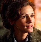 Is there a clause in Julia Roberts's contract stipulating that, whatever film she is in, other characters must endlessly proffer comments about how amazing, wonderful, brilliant and beautiful she is? This has been a tendency in her work since The Pelican Brief (1993), and it shows no sign of abating soon. In Mona Lisa Smile, this trend even leads to planting a moment in which her on-screen boyfriend compares her to – you guessed it – Mona Lisa, with the requisite accompanying monologue about the inscrutable mystery of her gorgeous smile. This is later followed by a scene in which a group of art appreciation students pore over the painting, unknowingly amplifying the boyfriend's compliment by referring also to Mona's inner strength, suffering, pride and sexiness. I expected Chaka Khan's "I'm Every Woman" to make an appearance on the soundtrack at this point. And perhaps it would have if the film had not been set in the 1950s – although this is not a movie strong on historical and cultural accuracy. Katherine (Roberts) teaches an art class at Wellesley College so progressive for its time that she has her previously airheaded girls chirping about "the context in which an artwork is seen and evaluated" and making allusions to Walter Benjamin's theoretical essay "The Work of Art in the Age of Mechanical Reproduction" in no time flat. But in case you get the impression that this is a highbrow work, such throwaway lines of erudition run second place to banter among the girls that their mysterious-beautiful-amazing teacher also had a "torrid affair" with William Holden in Hollywood – and when Katherine is faced with this charge, she simply smiles knowingly, like Mona Lisa ... Mona Lisa Smile is a familiar tale of empowerment-through-pedagogy in the vein of Dead Poets Society (1989). Katherine is the modern, independent woman who arrives to liberate her students from their tunnel-vision destiny as wives, mothers and homemakers. Naturally, she comes up against conservative forces on the Wellesley staff as well as in her classroom – notably, the hard-as-nails, bossy Betty (Kirsten Dunst). But this is a movie which refuses to take a definite viewpoint on its material. It strikes out in every direction, afraid to offend anyone. It plays equally to those who think the '50s were hell, as to those who now find it kitsch heaven. It supports Katherine's independence, but also finds room to affirm the viewpoint of Joan (Julia Stiles), who spiritedly defends the traditional female role in preference to a career as a lawyer. It shows Katherine as modern, but also neurotic. It hands the star a succession of fawning boyfriends, but also takes them away so that she can ride off into the sunset with her head held high. The film has some nice moments, particularly involving the plucky Connie (Ginnifer Goodwin) and her fight, against all peer-group odds, to get and keep a nice guy. Maggie Gylenhaal from Secretary (2002) has a less uplifting part as Giselle, the girl who sleeps around with male teachers and husbands, and regrets it afterwards. The neat resolution handed to her is as little believable as most of the other outcomes in the plot. As directed by Mike Newell (Four Weddings and a Funeral, 1994), Mona Lisa Smile would have been a better and more enjoyable movie if it became – as it often promises to – a 50s-style soap opera, teeming with pregnant teenagers and small-town scandal. But everything here is streamlined into a comfortable blandness, and all one can remember five minutes after the end credits is the beaming dial of Roberts. MORE Newell: Donnie Brasco, Harry Potter and the Goblet of Fire © Adrian Martin February 2004 |