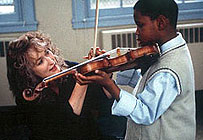 I have a weakness for films about heroic teachers fighting miserable school conditions and taking on an impossible task: to initiate a bunch of alienated, poor, violent kids into the divine mysteries of higher mathematics (Stand and Deliver, 1988) or literature (Dangerous Minds, 1995). In Music of the Heart, Roberta Guaspari (Meryl Streep) takes her fifty violins to the underprivileged children of Harlem. As with all films of this type, the action resembles that of a sports story: it's a matter of training, discipline, extra rehearsals and finally the big game – which here is the end-of-year concert, and ultimately (when Roberta's courses are threatened with extinction) a fund-raiser at Carnegie Hall. Roberta is quite a coach. While the teachers around her are bound by protocol, caution and politically correct attitudes, Roberta just barges in. With her students, she is demanding, bullying and merciless. But she is also totally committed and generous, so they all love her. As in Erin Brokovich (2000), the heroine's romantic and family activities suffer because of her obsessive devotion to a cause. Streep brings much vitality and charm to this role. But she is a terribly ostentatious performer: it is seemingly impossible for her to listen to another actor without meaningfully rolling her eyeballs, fidgeting and heaving a sigh. This film boasts some clumsy, point-making dialogue worthy of Australian playwright David Williamson. At one point, an angry, black mother yanks her child out of the class and confronts Roberta: "My kid ain't gonna play no music by dead white males. Can you name me one black classical composer?" Naturally, she is easily talked out of her ideological prejudice. This is in fact a telling vignette, in ways that may have escaped the consciousness of director Wes Craven. Many films about the greatness of the canon of Western art in music, painting and literature have a tough time keeping out all troublesome traces of 20th century popular culture. They are, at heart, fantasies about a high culture frozen in aspic, supposedly relevant to all peoples at all times. Music of the Heart makes one tiny concession to the vast pop traditions outside Roberta's classroom, in a rather awful moment during the Carnegie Hall concert that features a famous 'fiddle' player wearing a cute hat. The rest of the movie exhibits a manic devotion to high culture – its institutions, values and stars – that can only be described as obsequious. All this is directly relevant to Craven and his evolution as a filmmaker. Craven began as a Professor of Literature before letting his hair down with such gruesome, remarkable horror-dramas as Last House on the Left (1972) and The Hills Have Eyes (1977) – films that he today calls "cries of rage". For almost thirty years, all the way to Scream 3 (2000), Craven has found himself a prisoner of the low genres – and he has made no secret of his desire to be accorded respectability and legitimacy as a certified real artist, beyond the cultish acclaim granted by his legion of loyal fans. Music of the Heart tells a heartwarming, true-life story in an efficiently corny way. But Craven tries just a little too hard to live up to the standards of what he calls non-genre cinema – safe, middlebrow and sentimental. It's surely about time for another cry of rage from this talented, troubled soul. MORE Craven: Red Eye, Scream, Vampire in Brooklyn, Wes Craven's New Nightmare, Shocker © Adrian Martin May 2000 |