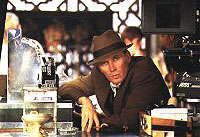 It has long been a piece of folk wisdom in the film industry that writers rarely make good subjects for stories. What could be less cinematic than the sight of a novelist, alone in his or her study, hunched over a typewriter or computer terminal? Yet, judging from a cycle of films from the early '90s, it would seem that the writer is the tormented, dramatic hero par excellence. For the protagonists of Barton Fink (1991) and Communion (1989), the usually mundane condition of writer's block brings forth grand visions and surreal nightmares. And then there are movies as different as Steven Soderbergh's Kafka (1991) and Jon Amiel's Aunt Julia and the Scriptwriter (1990). Naked Lunch takes us into the wild, hallucinatory mind of Beat author William Burroughs. Writer-director David Cronenberg takes an unusual approach to adapting Burrough's notorious, free-associative fantasy novel. Ideas and images from many Burroughs stories are framed within a loosely veiled biography of the author's own, very seedy life. Thus we are given William Lee (played with unnerving cool by Peter Weller), a pest exterminator and a junkie. After playing a fatal game of William Tell with his wife Joan (Judy Davis), he plunges deep into a twilight zone of drugs and madness. In the strange, treacherous, exotic world of Interzone, Lee becomes a pawn in an unfathomable political game. Lee is no ordinary writer. His typewriters speak, mutate into monstrous beings, and engage in hideous sexual acts. Other creatures that Lee encounters in Interzone – such as the Mugwamps – are even more articulate and sinister. And the slick, scheming human beings he meets (including Roy Scheider as Dr Benway and Ian Holm as Tom Frost) are no less inscrutable or disquieting. Cronenberg is well known for his brilliant, gory horror films of the '80s like Videodrome (1983) and The Fly (1986). Naked Lunch has its icky moments, but overall it is a fully certified art film, slow and reflective. The director's control over performances, images and an indelible brand of sick, ironic humour has never been more subtle or masterful. Yet Naked Lunch is also an elusive film. At times, it seems as if Cronenberg is determined to capture the banality and monotony of a junkie's inglorious existence. Is the film, ultimately, a celebration or a criticism of William Burroughs and his perverse art? The finale – one of the blackest, most unnerving scenes that Cronenberg has ever conceived – will certainly move audiences to ponder that question long and loud. MORE Cronenberg: eXistenZ, M. Butterfly, Crash © Adrian Martin May 1992 |
