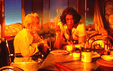 Tracey Moffatt's career in photography, film and video is powered by two major drives, both of them very theatrical in nature: a drive towards melodrama at one extreme, and towards comedy at the other. The short film Night Cries: A Rural Tragedy, Moffatt's masterpiece to date, gives full vent to the melodramatic side of that speculative equation. The project's sources are manifold: its images and sounds emerge as from a volcano, where deep down stir the historical realities of Aboriginal dispossession, Hollywood's grand "woman's melodramas" with mothers and daughters slugging it out, Moffatt's memories of her own relation to the white family she grew up with, and a unique, bizarre Australian cinema classic, Charles Chauvel's Vidor-style Aboriginal melodrama Jedda (1955). The style of Night Cries is high-artificialist – a virtually wordless two-hander played within and against a starkly unreal studio set, punctuated by flashbacks and inserts that combine pictorial, graphic and gestural elements in a similarly liberated way. Night Cries is a passionate film whose vivid representations have an almost abstract force: cultures, generations, colours and sound-blocks smash against each other and sometimes intermingle in unexpectedly tender ways; the entire drama is immediate and palpable, perfectly comprehensible on an emotional and deep-structural level. Yet it is also a completely modernist film, the furthest Moffatt has gone towards pure avant-gardism, a fragmented and elliptical scenography no less mysterious or compelling than that of her haunting photo-series Something More. One watches and hears country singer Jimmy Little perform his ditty about "telephoning to Jesus", while his body and voice are lacerated by Moffatt and drawn into a swirling montage of terror, humiliation, despair and death. MORE Moffatt: Bedevil, Nice Coloured Girls MORE Australian indigenous films: Black Chicks Talking, Whispering In Our Hearts, Beneath Clouds, The Tracker, Ten Canoes, Rabbit-Proof Fence © Adrian Martin October 1999 |