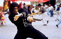 If you want to judge the distance between a master and his disciple, compare the great Sergio Leone Westerns of the 1960s like The Good, The Bad and the Ugly (1966) with Robert Rodriguez's lame Once Upon a Time in Mexico. Leone, in his day, was accused of making superficial, cartoonish exaggerations of the Hollywood model – films lacking moral or artistic depth. How wrong that judgement looks now. At first glance, Rodriguez seems to be making all the right moves. There is the epic, heroic sweep of the camera movements, the angles that make his heroes and anti-heroes look like gods, the choreography of all action to a flamboyant and often amusing musical score. But today it is clear that Leone possessed what his imitators usually lack: a sense of politics. No matter how outrageous or convoluted Leone's plots became, he always held on to what was at stake in collective life-and-death struggles. By contrast, Once Upon a Time in Mexico is a charade where endless talk of The General, the Cartel, the Mob Boss, the cops, and especially that grand abstraction 'the people', never amounts to anything meaningful. The dialogue says it all. Scriptwriting is not Rodriguez's best suit, and this film is full of lumpy lines like "Are you are a Mexican or a Mexican't?" and "I don't think, I drink". The discussions of political revolution are no more eloquent. The story ostensibly centres on its glamorous hero, El Mariachi (Antonio Banderas), who is undergoing a rather uninteresting crisis about whether to avenge his murdered bride, Carolina (Salma Hayek), in the midst of a turbulent overthrow of the government. But Rodriguez is far more fixed on his prime villain, Sands (Johnny Depp), a CIA operative who walks the streets of Mexico wearing a CIA T-shirt, coldly killing anyone in his path while dispensing supposedly hardboiled witticisms. I am surely not the only viewer who is sick to death of these florid villains in contemporary movies who stride around quoting Homer or Nietzsche and behaving like editors of the Epicure pages of a bourgeois newspaper. What's worse, Rodriguez even tries to turn Sands into a figure of sympathy in the last half hour. After all, this poor American assassin has a soft spot for kids. Once Upon a Time in Mexico is the closest you can get to making a Western while ostensibly telling a modern-day gangster story. Rodriguez, however, seems constantly on the verge of turning the whole affair into a musical comedy. And this might have been the wisest move, since the film as it stands falls far short of its closest rival, Tarantino's stylish Kill Bill (2003/4). Like that movie, Once Upon a Time in Mexico tends to fragment into a string of attractions – a cameo from comedian Cheech Marin, an extravagant flashback to El Mariachi's blissful marital days, a couple of busy action set-pieces. But Rodriguez has lost sight of his trump card – the proud championing of Mexican popular culture that energised his earlier films like Desperado (1995). Now seemingly stuck with churning out re-treads of his former glories – another El Mariachi, another From Dusk till Dawn, another Spy Kids – Rodriguez is at a low point of his career. Like many of his generation, he needs some inspiration that does not derive solely from a callow love of other, better movies. MORE Rodriguez: Spy Kids 3D, Sin City, Four Rooms © Adrian Martin February 2004 |