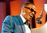 When it comes to fiction films, people both within and without the industry endlessly argue over whether a hero needs to be likable. For the makers of biopics, this becomes a particularly delicate question. Ray Charles is, by any estimation, an awesome figure in the history of popular music. But was he really a nice guy, likable enough to fill the shoes of a Hollywood hero? Or was he more like the Raging Bull, Jake La Motta – driven, tormented, addicted, a source of pain for those around him? Charles, as incarnated with eerie accuracy by Jamie Foxx in this intense and colourful biopic, is no teddy bear. He spends most of his young adult life – the film takes us from his career beginnings in the 1940s to the mid 1960s – hooked on heroin. He cheats on his sweet, devoted wife, Bea (Kerry Washington), with his unofficial 'second wife' on the road, Regina (Margie Hendricks) – after dumping another girlfriend in the band, Aunjanue (Mary Ann Fisher). He is disloyal to his long-serving manager, Jeff (Clifton Powell), the moment he is pampered by a newcomer, Joe (Harry Lennix). All that Charles really has going for him, at least in Hollywood feel-good terms, is that he dealt with his blindness with great courage and tenacity, that he fought – albeit belatedly – against Jim Crow segregation, and that he finally quit the junk. A more contentious issue among music fans – whether or not Charles effectively sold out and became increasingly middle-of-the-road in he course of his career – is glossed over by Ray. The release of this film coincides with a rash of biopics of various sorts, from the historical epic Alexander (2004) to Martin Scorsese's The Aviator (2004), about Howard Hughes. Inevitably, this trend is accompanied by journalistic musings about the dire limitations of the biopic form – how it condenses, simplifies and often outrightly distorts the facts of a person's life. Charles, for instance, had another wife before Bea – and his twelve children came from a total of seven women. But what do we really expect from a biopic? Of course, what a film like Ray offers is less a summary than a stylisation of its subject's life. In fact, it is possible to prefer those biopics (like the Ike and Tina Turner story, What's Love Got to Do With It? [1993]) which are the most extremely stylised – shaped like a soap opera or a pop song – over the piecemeal, doggedly realistic portraits. In this light, the best aspect of Ray – which is the finest hour in the generally unimpressive career of its director, Taylor Hackford (An Officer and a Gentleman, 1982) – is its vivid flashes of black musical culture, whether in down-home rural settings or on stage. And a scene that some find risible – when an argument between Ray and Margie morphs into a run-through of "Hit the Road, Jack" – indicates that this entertaining biopic may have played even better as a full-out musical. MORE Hackford: White Nights MORE music films: The Thing Called Love, Pure Country © Adrian Martin January 2005 |