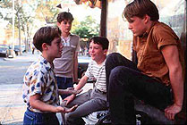 The star-studded Barry Levinson drama Sleepers (1996) is notable, within my scheme of things, for three reasons. Firstly, it is one of those movies that has me shaking my head slowly and sadly as the final credits roll and I head for the exit, asking myself: 'What on earth was that film about?' Secondly, it is one of those movies that – because of its slightly hot subject matter – hits odd buttons and gets strange responses in the popular press. Thirdly, the plot of the film is such that it prompted an amazing and virtually unprecedented editorial gesture in the film review pages of a certain populist Melbourne newspaper. About one or two paragraphs into the resident critic's review of the film, there was a sudden editorial disclaimer in bold type, saying something like: 'If you do not wish to have the plot of this film spoilt for you, please skip the next six paragraphs'. Little did I know that this was an Internet-created habit finally hitting the mainstream press; the declaration of plot 'spoilers'. Sleepers is about a group of four working-class boys who are tough-and-tumble friends in New York's Hell's Kitchen in the mid 1960s. They are lovable, little-devil types, crazy but innocent, and rather like the kids who grow up to be gangsters in Sergio Leone's Once Upon a Time in America (1984). They are irascible pranksters, too, but one of their pranks, involving a mobile hot dog cart, goes tragically wrong, and it lands them in a Boy's Home. Once inside this institution – and here is the core motor of the plot – the boys are repeatedly, viciously abused by the guards, especially by an evil ringleader, Sean Nokes (Kevin Bacon). Once the boys are released, the film cuts to the 1980s. Two of the boys, now streetwise operators, stumble upon Nokes and immediately kill him. The rest of the film is a very complicated court case. Everything is rigged in the trial. The prosecution lawyer trying the two suspected killers is their boyhood friend who was abused alongside them, Michael Sullivan (as an adult, played by Brad Pitt). The defence lawyer is also a patsy, merely performing the script that Sullivan has prepared for him. And outside the courtroom, the fourth guy of the original group, Lorenzo 'Shakes' Carcaterra (Jason Patric), is silently mobilising all his home-block mob connections to variously bring in or bring down the other abusers from the Boy's Home days. I suggested earlier that this film garnered some odd responses in the press. The response that most caught my attention is the angry claim that the movie is, above and beyond anything else, homophobic. The argument basically runs like this: In movies where women kill the men who abused them – Thelma and Louise (Ridley Scott, 1991) is a classic example – and these movies are big hits, there is often a public outcry, at least from easily bruised conservatives, that such depicted acts are unjust, immoral, vigilante behaviour. In movies that show men killing for revenge, there is rarely the same kind of charge or controversy. And in Sleepers, to give more weight to the supposed rightness of this particular revenge quest, the initial crime, the original sin, is presented as the most horribly imaginable act of all – the homosexual rape of heterosexual boys. So does that make Sleepers homophobic? It does strike me that there is something logically wrong with this pointed comparison between female revenge movies and male revenge movies. Indeed, some might see it as the worst kind of forced, 'politically correct' reading or mangling of a film. Because if we say that it is alright for Thelma and Louise to step outside the law and kill their attacker – since rape is an exercise of power, not of sex – then we have to at least entertain the thought that it is just as alright for the four heroes in the film to go after the guys that abuse them – because that is an exercise of power too, not of sex. As a singular drama with potentially its own artistic force and truth, that has got to be allowed as a valid drama. I am not trying to dismiss the idea that society at large regards women killing and men killing – whether on-screen or off – in different and unequal terms. If I felt that Sleepers was genuinely, deep down, a homophobic film, I would not be content to just skim that interpretation off the surface of the plot. I would want to ask: Is there some larger, all-pervasive nervousness about masculinity or heterosexuality in the film that is getting channelled into a dubious, demonising depiction of homosexuality? In Sleepers, I find only one small moment pointing to such a layer of male anxiety. The four guys in this movie do the all usual homo-social rituals of bonding, hugging, singing and hanging out. At one point, the only girl they all know bursts into the room, looks at the guys arm in arm, and says "Is this a gay bar or what?", and one of them replies cheekily, "Well, it was until you walked in". But that is just a moment, a joke – it cannot be construed as a grand-slam homophobic symptom. But the big point I want to make about Sleepers is this: it does not really make any sense on any deep-structural, dramatic level. It has no artistic force, or truth. Every supposedly meaningful element in it is just a touch here or a smudge there, gussying up a picture that is, finally, very schematic and simplistic indeed. But before I get to that simple picture, I need to say a few things about the respected writer-director of the movie, Barry Levinson. I have never been very fond of Levinson's films, except for his gangster epic Bugsy (1991), which had a terrific script by James Toback. From the first Levinson film that many raved about, Diner (1982), through Tin Men (1987) and Rain Man (1988), Levinson's films have bothered me and left me very dissatisfied. There are two main reasons for this. Firstly, Levinson is fairly obsessed with tales of male pathos, and he delivers them to us in a particularly gooey way. He is alway