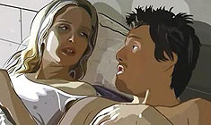 One of the best scenes in Richard Linklater's Waking Life shows a group of disaffected young men cruising the streets. They mouth slogans about the evils of consumerism, the society of the spectacle and the need to "create situations" in everyday life. Then they spot a very old, gummy guy perched up the top of a telephone pole. "What are you doing up there?" "Nothing." "Do you need any help?" "Ah, no". As they trundle off, one of the young neo-Situationist philosophers muses, "We're no better than him. He's all practice and no theory, we're all theory and no practice." It is not often that one sees such a daggy, droll scene in an American animated feature. Waking Life is an unusual project at every level. Linklater shot and edited, very quickly and cheaply, with a great deal of improvisation, a feature on digital videotape. The material is in the manner of his first feature, Slacker (1991) – a meander though everyday life, where a bunch of obsessive, eccentric, befuddled people talk endlessly, one by one, about how they see the world. From the start, Linklater intended this material to be turned over to a large team of animators – each of whom would take a single sequence and transform it, with the help of software invented by Bob Sabiston. At its most basic level, this is a version of the technique known as rotoscoping, which is extensively used in mainstream animation – the tracing of bodily movements and facial gestures from live-action footage. Waking Life, however, pushes this technique in radical directions. On the one hand, we can never forget that much of what we see – and virtually all of what we hear – depends on real people with their odd ways of moving and speaking. On the other hand, the animators were encouraged to take the images in surreal directions. So the colours and contours constantly shift and change, faces mutate, and strange objects frequently appear in the air. All of this is part of the film's loose theme. Waking Life poses as an investigation into the relationship between dreams and reality. The teenage hero wanders about asking friends, teachers and strangers about imagination, "lucid dreaming", and intense experiences of all kinds. At a certain point, it becomes clear that he, too, is caught in a dream – and that no matter how many times he seemingly wakes up, he is still floating through an imagined world. Just as reality is a far-off land that the hero only occasionally glimpses, the original footage shot by Linklater exists only as a kind of trace that can never be completely made out. This is a project that gently puts into question several of the usual tools of reviewing. Authorship, for example – is it still possible to still call this Linklater's film when the diverse styles of so many different graphic artists (essentially undirected by Linklater) are on display? Perhaps Linklater should be seen more as a genial ringmaster here than an auteur. Or performance – can we really say Wiley Wiggins is the star of a movie in which his appearance changes radically every few minutes, and in which his real self is never glimpsed? Yet there can be no doubt that his personality permeates every frame of the finished work. Waking Life is an intriguing project, and certainly the first of a new kind of popular movie. It is never quite as good or inventive as it could have been. After a splendid opening scene involving a group of musicians (Glover Gill and the Tosca Tango Orchestra) in rehearsal – in which every element in the image literally dances – too many of the scenes are inert. Talk dominates, as in so many films of an American indie persuasion – and when the words stop, bare silence creates an uncomfortable void. The animators do not liberate themselves enough from the photographic raw material. Linklater sometimes lets himself explore frankly fantastic possibilities, such as when a protester sets himself alight, or two men engage in violent gunplay, or a film theory lecture/performance is delivered by an extremely gifted monkey. Too often, however, the animation only adds a kind of illustrative doodling – if someone mentions birds, a bird flies through the frame, if the conversation turns to love, a heart pops up and then vanishes. The film captures a youthfully naïve state of gasbagging about all things existential – peppered with an occasional note of New Age mysticism or a professorial remark like: "I have read the postmodernists with some interest and even admiration." This is, ultimately, both the charm and the limitation of Waking Life. I sometimes thought I would scream if I saw yet another mass of wavy lines accompanied by yet another airy statement to the effect that "life is a dream" or another breathless reverie about the need to "live in the moment". Yet, for all its maddening, hit-and-miss looseness, Waking Life does give Linklater a perfect way to express his dearest themes and moods – that poignant sense of the meaning of life slipping away at every moment, before you have a chance to grasp it. MORE Linklater: The Newton Boys, SubUrbia, Boyhood, Before Sunrise / Before Sunset © Adrian Martin March 2002 |